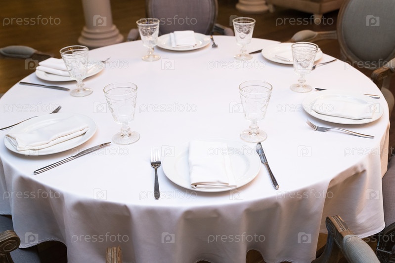 Насладитесь круглым обеденным столом с белой скатертью в ресторане