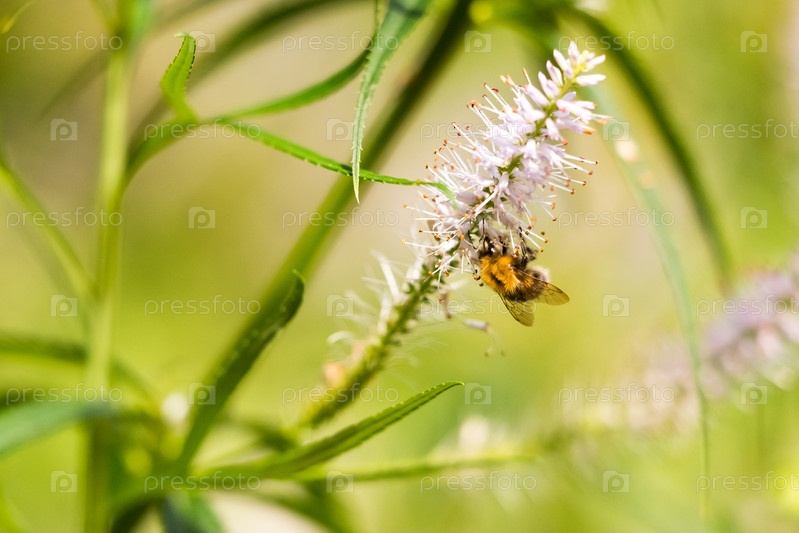 Пчела собирает нектар с цветов на зеленом размытом фоне