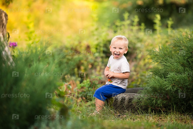 Счастливый мальчик в возрасте двух лет сидит на старой шине трактора в зеленых кустах на фоне солнечной поляны