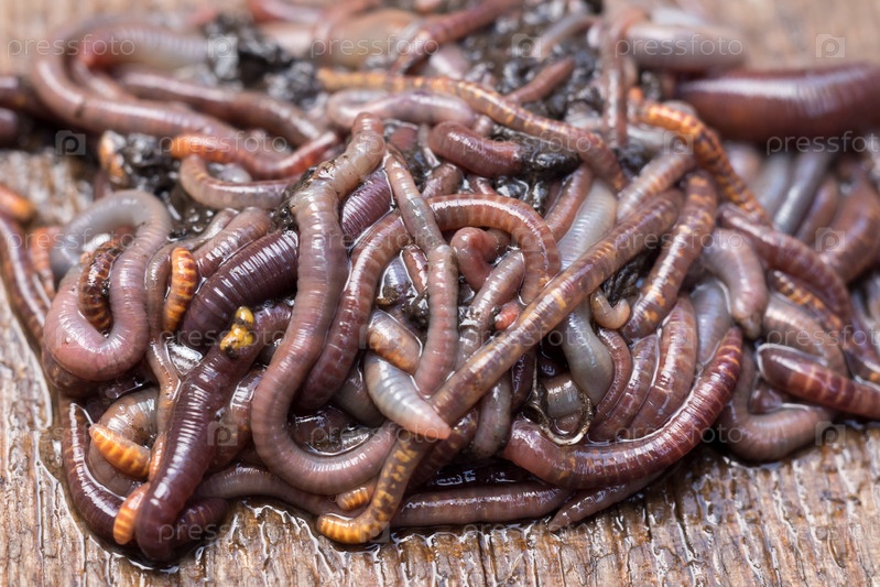 Дождевая вода и навозные черви на деревянной поверхности, приманка для рыбалки