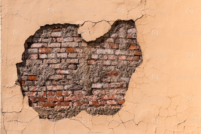 Старая стена дома с обвалившейся штукатуркой