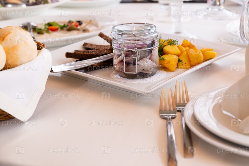 Запечатанная банка с соленой сельдью на праздничном столе с жареным картофелем