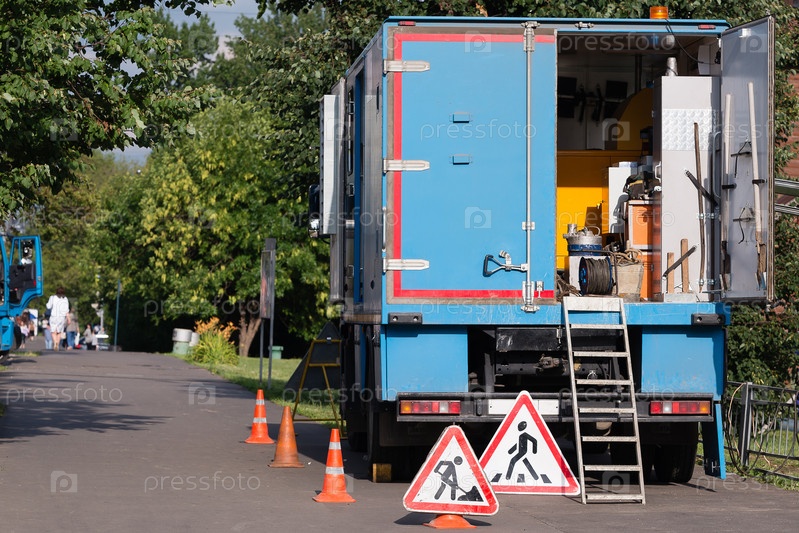 Грузовик аварийно-спасательной службы синего цвета, стоит на тротуаре с выставленными дорожными знаками и конусами, ремонтирует аварийные работы