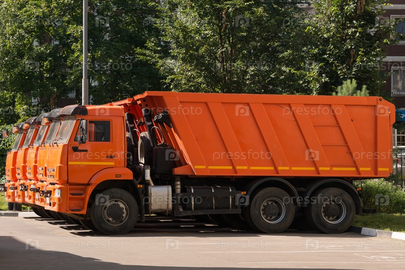 На парковке выстроились в ряд четыре оранжевых грузовика муниципальной службы