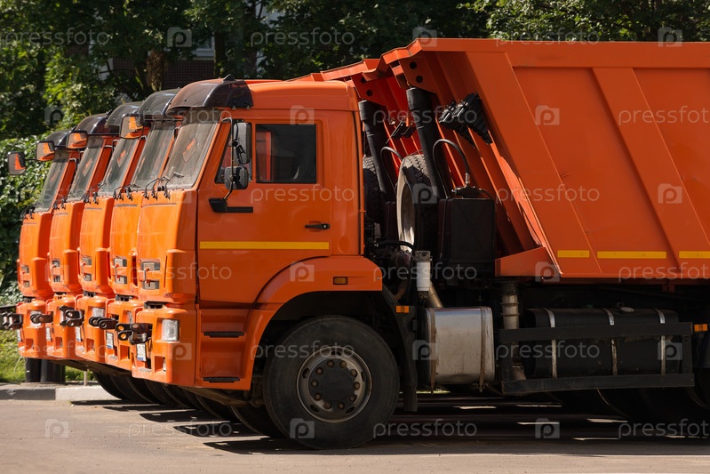 Четыре грузовых автомобиля стоят в ряд на парковке