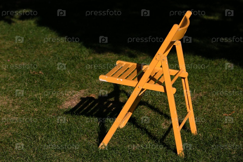 Желтый складной деревянный стул в солнечных лучах на зеленой траве