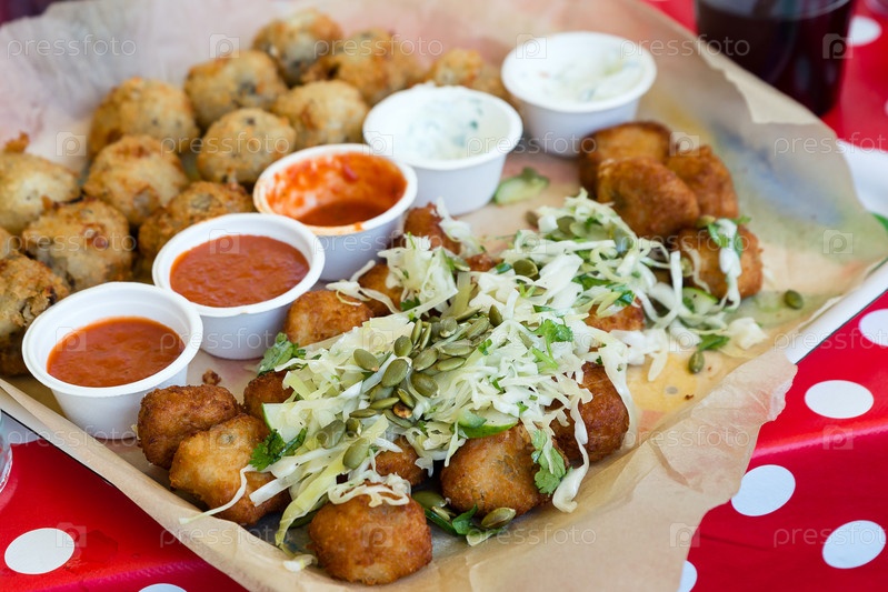 Поднос с жареным картофелем, набором соусов и салатом