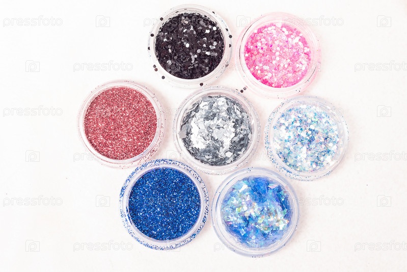 Маленькие разноцветные баночки с блестками и пайетками для татуировок на теле крупным планом