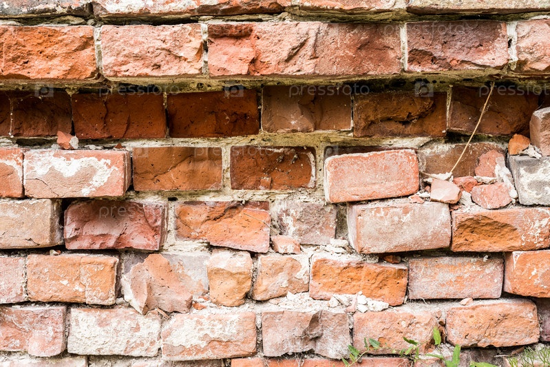 Разрушенная старая стена из красного кирпича, текстура