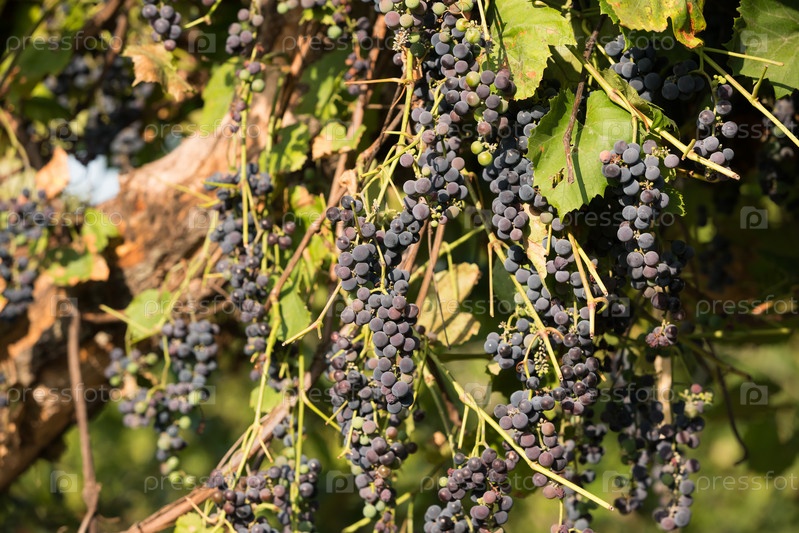 Гроздья спелого винограда на фоне зелени и листьев
