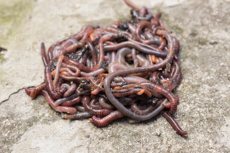 Дождевые черви и навозные черви на бетонной поверхности, приманка для рыбалки