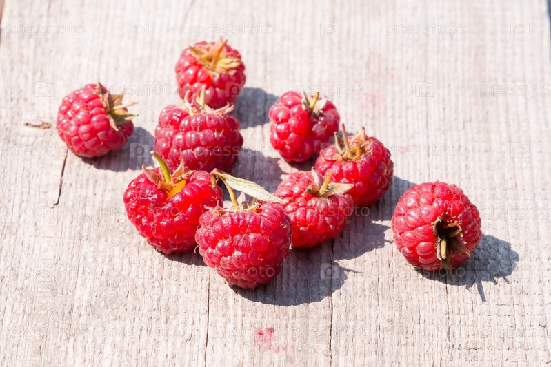 Спелые ягоды малины на деревянном фоне