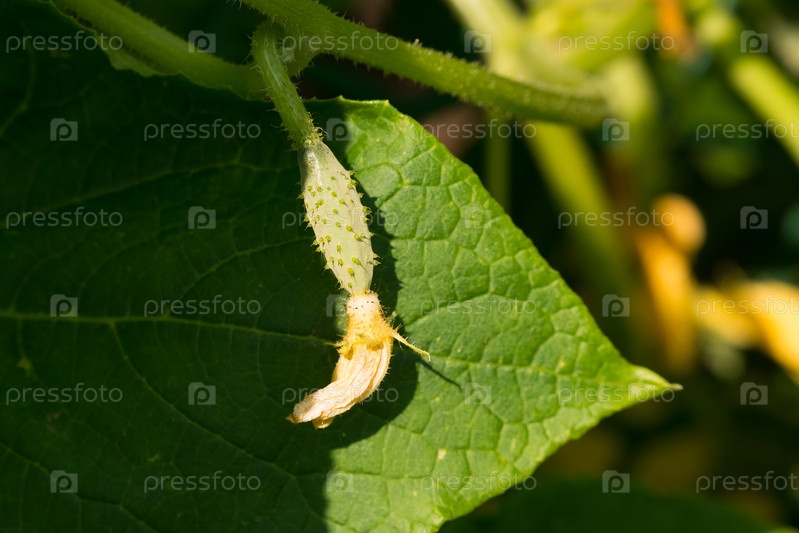 Молодой завязавшийся плод огурца на зеленом листе