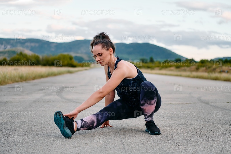Решительная спортсменка делает растяжку после интенсивной пробежки по пересеченной горной местности
