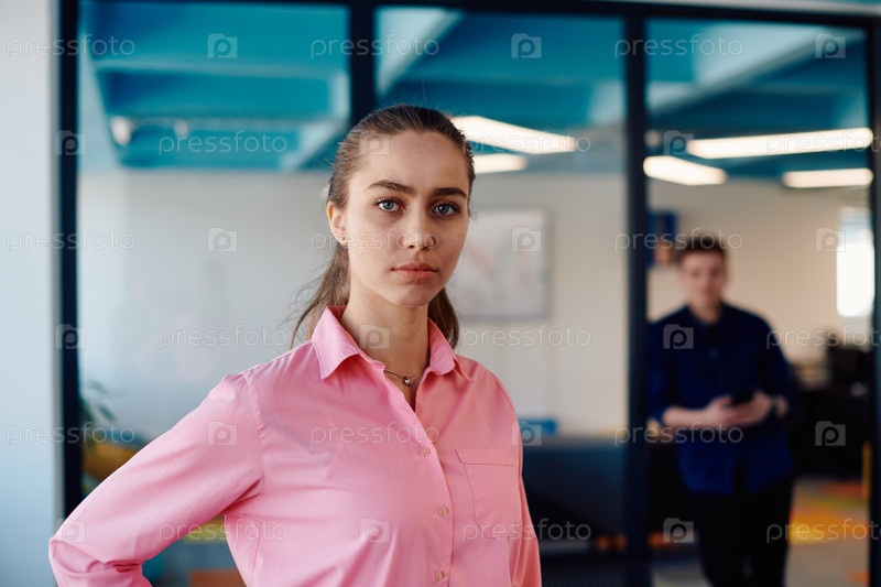 Портрет молодой улыбающейся деловой женщины в креативном открытом пространстве коворкинга стартап-офиса. Успешная бизнес-леди стоит в офисе с копирайтом. Коллеги, работающие на заднем плане