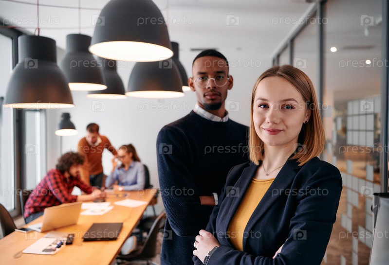 Динамичный лидерский дуэт: светловолосый директор и молодой афроамериканский предприниматель в офисной обстановке