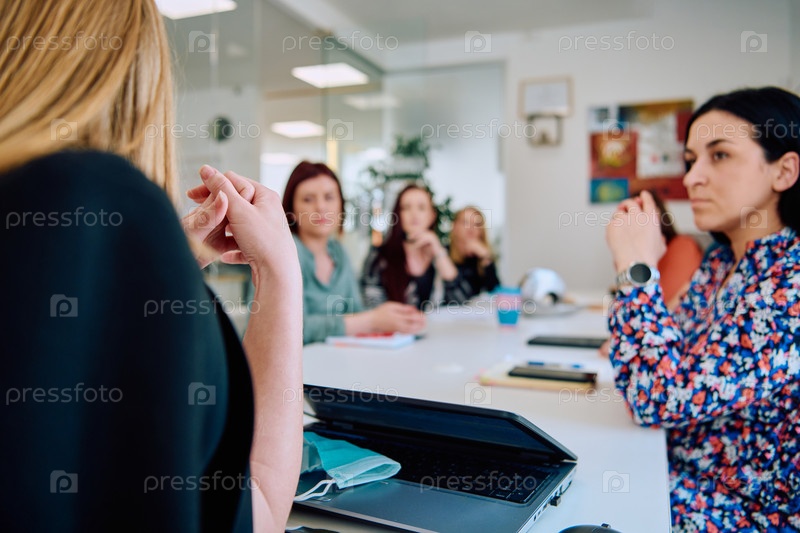 Разнообразная бизнес-группа обсуждает проекты в современном стеклянном офисе