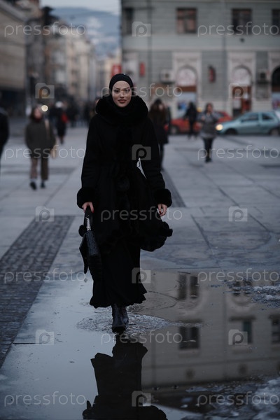 Мусульманка идет по городской улице холодной зимней ночью в хиджабе