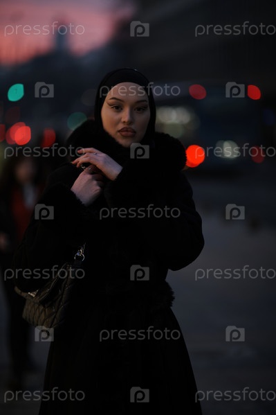 Мусульманка идет по городской улице холодной зимней ночью в хиджабе
