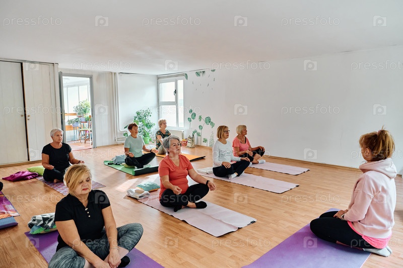 Группа пожилых женщин занимается различными упражнениями йоги, включая растяжку шеи, спины и ног, под руководством тренера в залитом солнцем месте, способствуя благополучию и гармонии