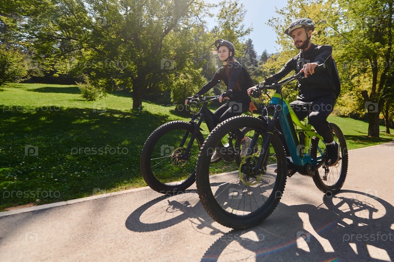 Счастливая пара, одетая в профессиональную велосипедную экипировку, наслаждается романтической велопрогулкой по парку, окруженному современными природными достопримечательностями, излучая любовь и счастье