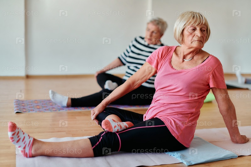 Женщины старшего возраста занимаются оздоровлением: йогой и растяжкой в залитом солнцем пространстве