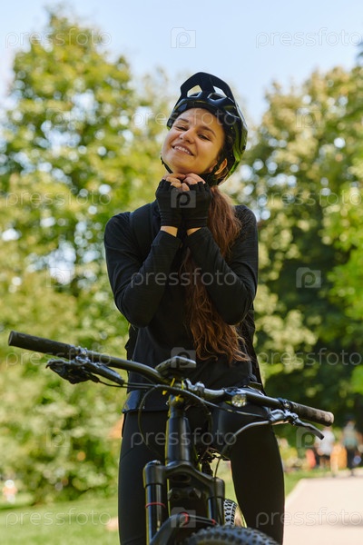 В лучезарных объятиях солнечного дня радостная девушка, облаченная в профессиональную велосипедную экипировку, находит чистое блаженство и жизненную силу, катаясь по парку на своем велосипеде, а ее заразительный смех отражает беззаботную гармонию момента