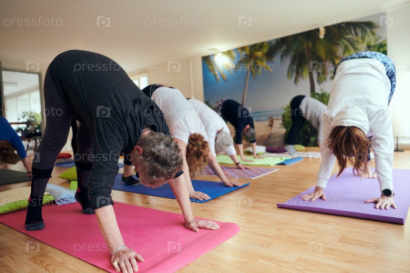 Группа пожилых женщин занимается различными упражнениями йоги, включая растяжку шеи, спины и ног, под руководством тренера в залитом солнцем месте, способствуя благополучию и гармонии