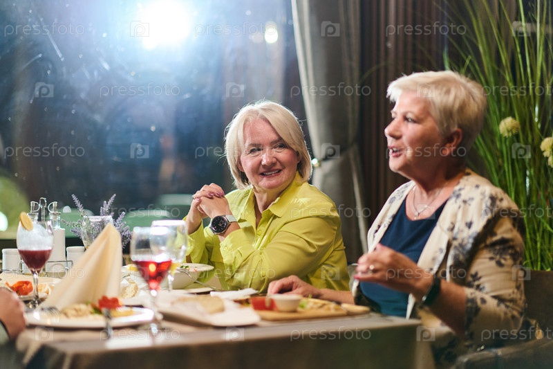Пожилые друзья наслаждаются восхитительным ужином, наполненным смехом, радостью и теплом непреходящей дружбы, олицетворяя вечное удовольствие от общения в современной обстановке