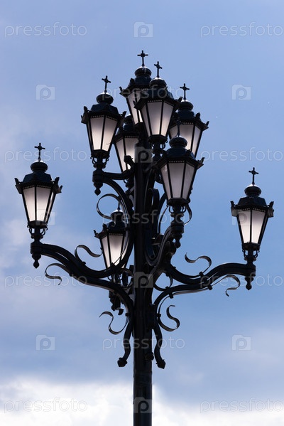 Электрические уличные фонари на фоне голубого неба
