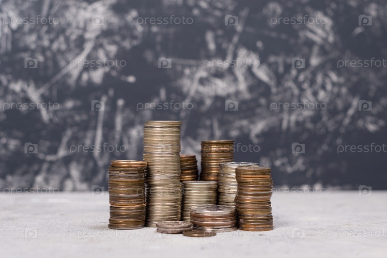 Стопки российских монет разной высоты на сером бетонном полу и темно-сером фоне