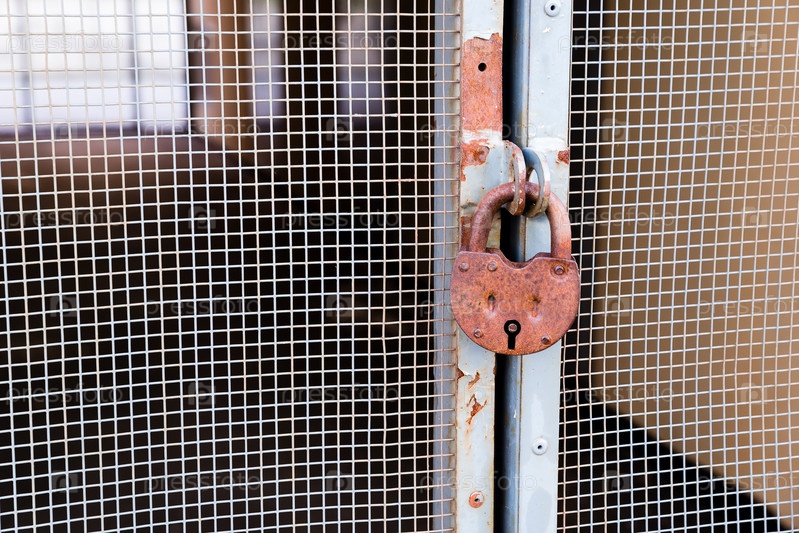 Крышка старого ржавого замка, висящего на решетчатой металлической двери