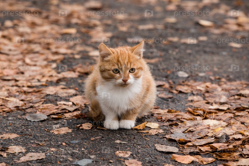 Рыжий котенок сидит на опавших коричневых листьях в холодный осенний день