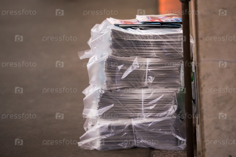 Четыре пачки свежей прессы лежат на бетонном полу