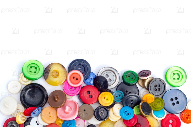 Цветные пуговицы из старой одежды для рукоделия оптом на белом фоне заготовка