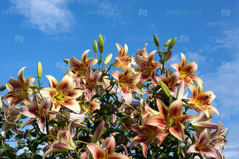 Большой букет садовых лилий на фоне голубого неба