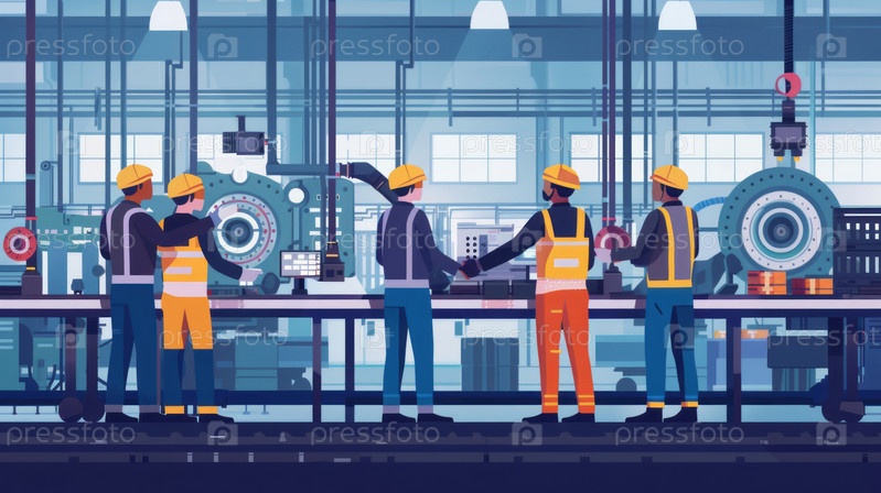 Рабочие в защитной одежде пожимают руки на производстве.Сгенерированное изображение