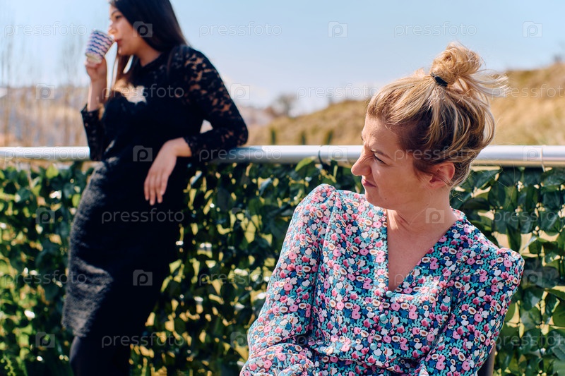 Блондинка-бизнесвумен отдыхает с коллегой на террасе