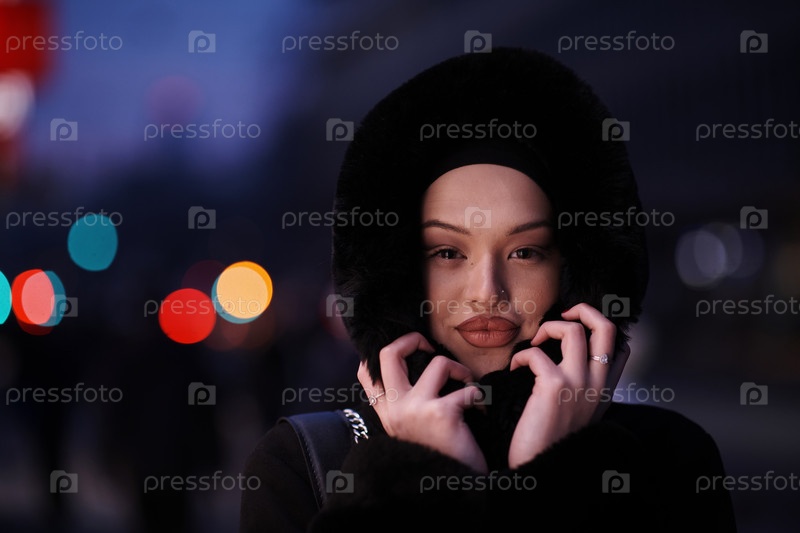 Мусульманка идет по городской улице холодной зимней ночью в хиджабе