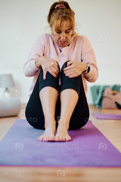 В залитом солнцем помещении пожилая женщина грациозно занимается омолаживающей йогой, уделяя особое внимание растяжке шеи, спины и ног, воплощая спокойствие и благополучие