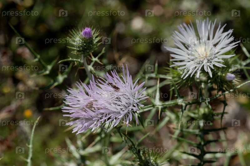 Паук (Salticidae) ждет добычи на лекарственном цвете (Galactites tomentosa) крупным планом
