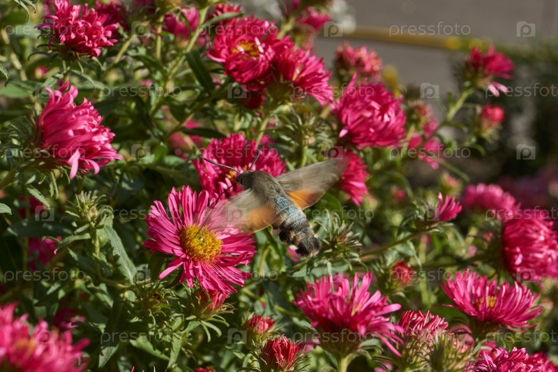 Макроглосс (лат. Macroglossum stellatarum) собирает нектар из цветов Осень, октябрь 2024 г