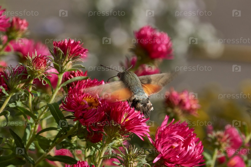 Макроглосс (лат. Macroglossum stellatarum) собирает нектар из цветов Осень, октябрь 2024 г