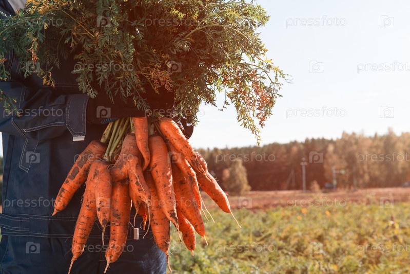 Руки фермера в перчатках держат пучок моркови