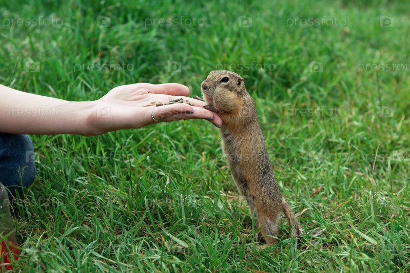 Женщина кормит суслика с руки в летнем парке