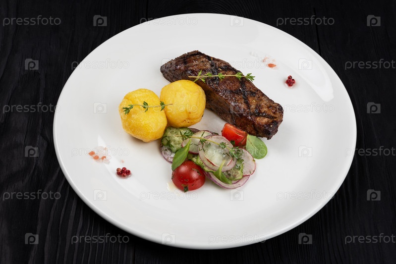 Жареный говяжий стейк с картофелем и овощами на белой тарелке на деревянном черном фоне