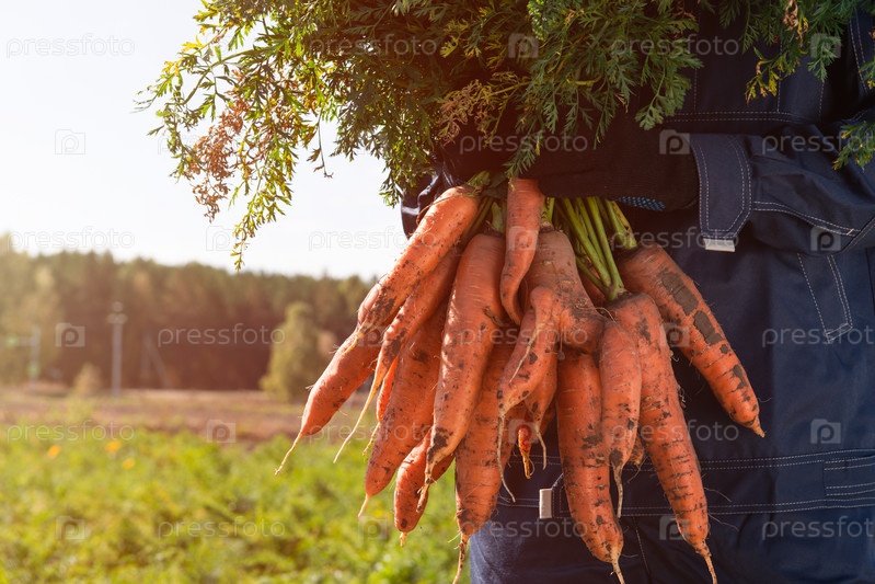 Руки фермера в перчатках держат пучок моркови