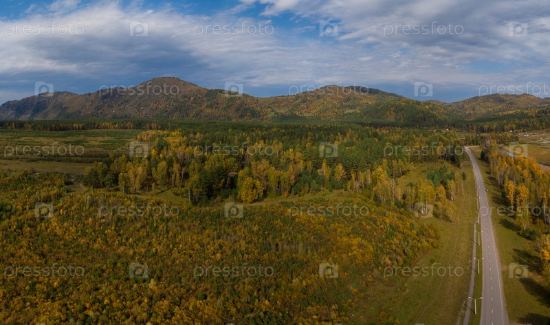 Вид с воздуха на дорогу в красивом осеннем лесу Алтая. Красивый пейзаж с пустой сельской дорогой, золотая осень на Алтае: деревья с красными, желтыми и оранжевыми листьями