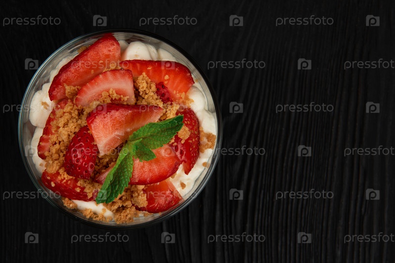 Сладкий клубничный десерт с печеньем и сливками, украшенный листьями мяты на черном деревянном фоне со кописпейсом