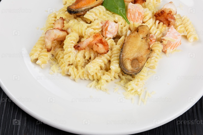 Паста с морепродуктами, мидиями, лососем и креветками
